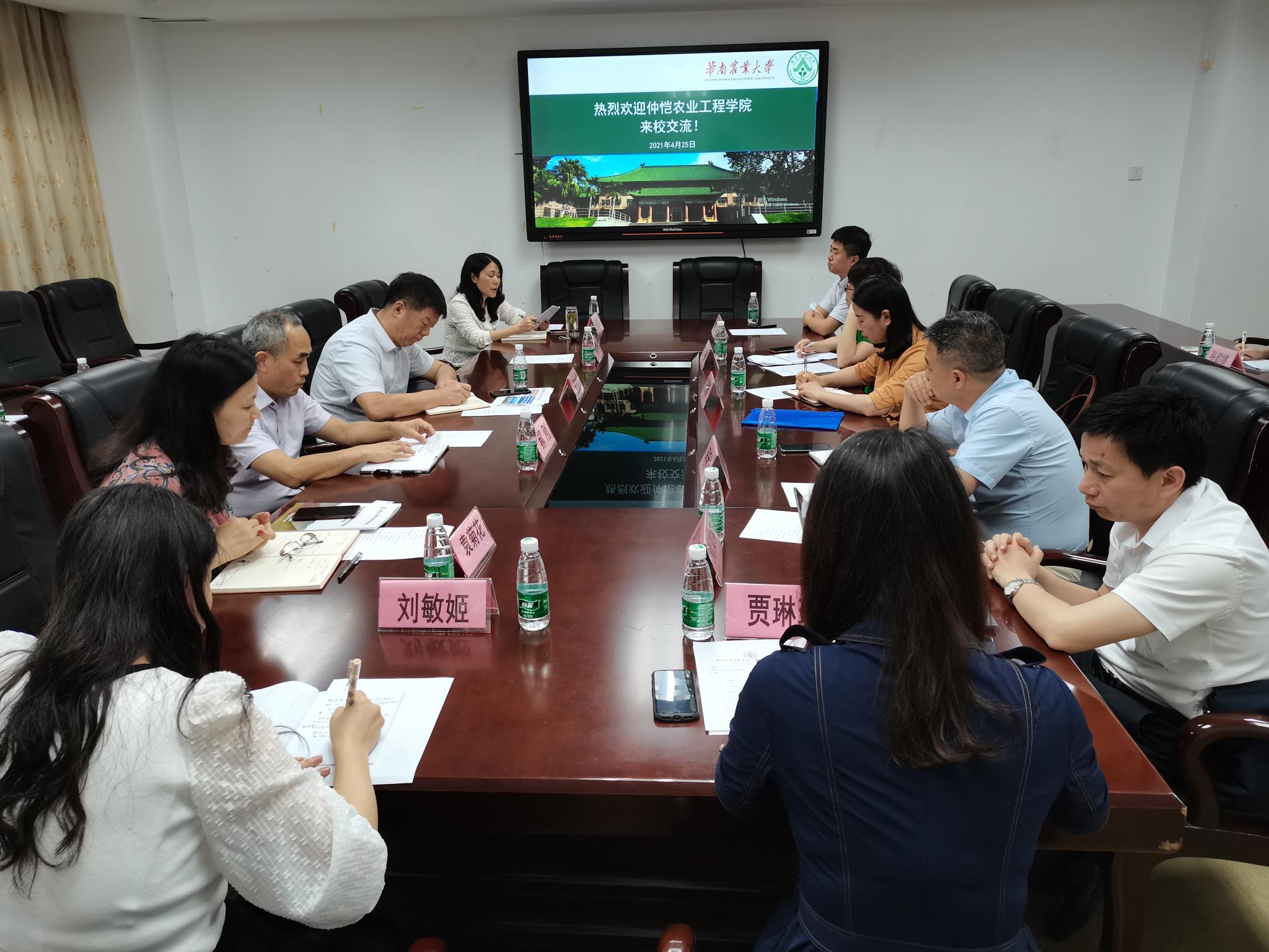 4月25日下午,外事处处长王健敏、发展规划处兼科技处处长周新华、国际交流培训中心主任余玉娴等率领我校外事处、发展规划处、科技处、国际交流培训中心4个部门共12人赴华南农业大学学习交流。华南农业大学国际交流处处长王建武、副处长袁菊花、国际教育学院副院长郝刚、科学研究院项目管理处副处长苏弟华等出席了交流座谈会。