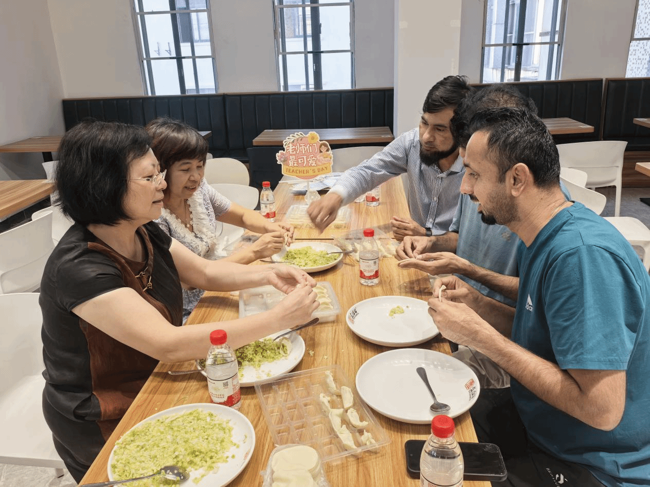 本次活动特别安排了广东省情介绍环节,展现了广东作为改革开放前沿阵地的活力与魅力,既呈现了现代都市的繁荣景象,也传递了岭南文化的深厚底蕴。现场还安排了传统饺子制作体验,外专外教们在工作人员的指导下,认真学习调馅、捏合、蒸煮等技艺,大家相互交流、默契协作,活动氛围温馨融洽。